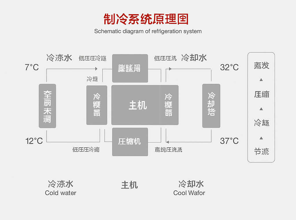 The central air conditioning system consists of a cold and heat source system and an air conditioning system. The refrigeration system provides the required cooling capacity for the air conditioning system to offset the cooling load of the indoor environment; the heating system provides the air conditioning system with heat to offset the heat load of the indoor environment. The refrigeration system is a vital part of the central air-conditioning system, and its type, operation mode, and structural form directly affect the economy, efficiency and rationality of the central air-conditioning system in operation.
