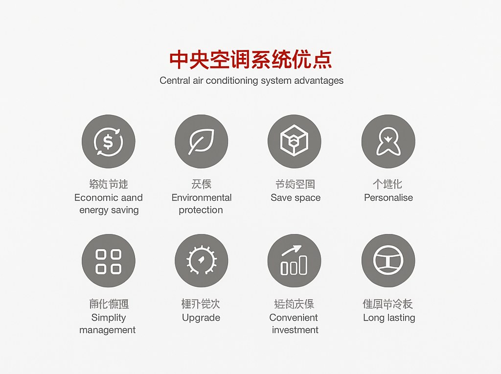 Central air conditioning is an air conditioning system that integrates cooling, heating, ventilation, air purification and other functions. It is widely used in commercial, industrial and residential fields.